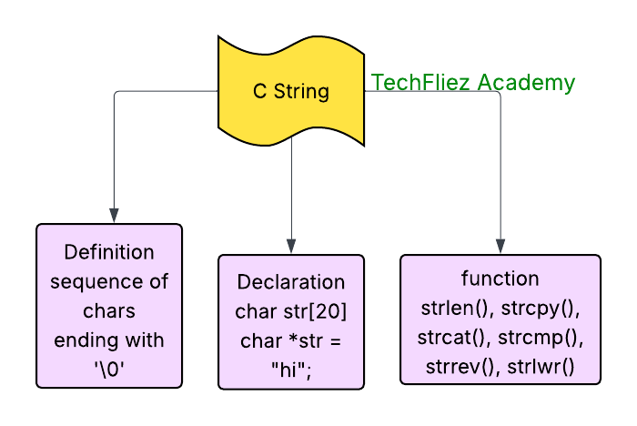 In C, a string is defined as a sequence of characters, stored in an array of type char. A string in C is terminated by a special null character (‘\0’), which marks the end of the string. This is a key difference from arrays that don’t necessarily have a terminator.