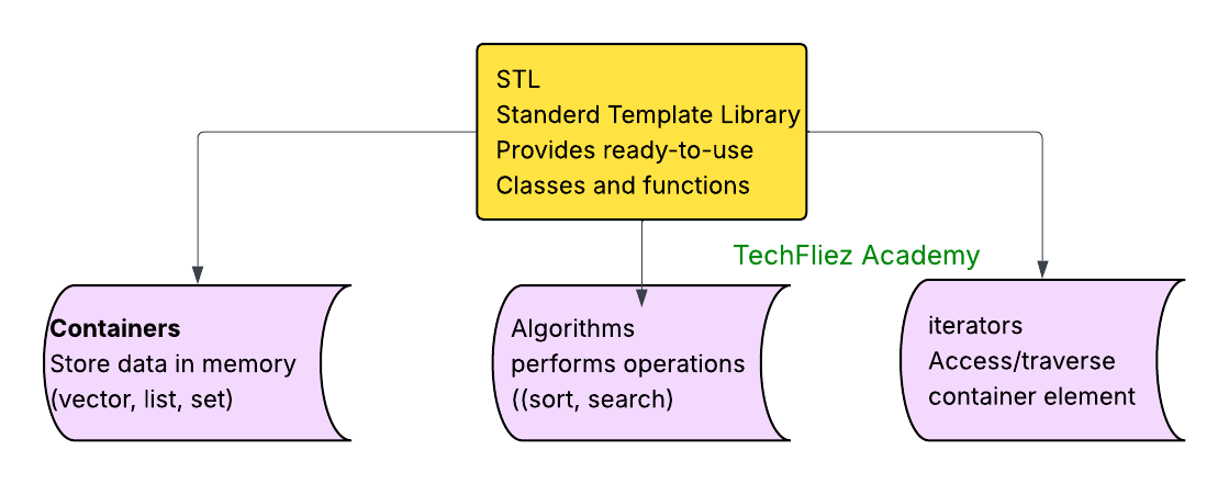 3. Iterators: These are objects that allow you to access elements in containers. They act like pointers and enable you to move through elements in containers such as arrays or lists.