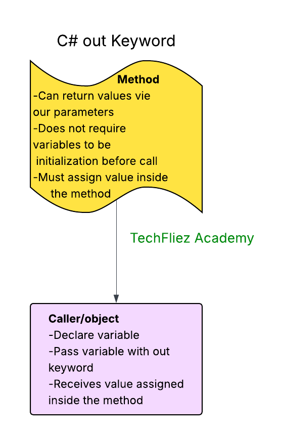 The out keyword is also used to pass parameters by reference, but it is specifically used when the method is expected to return a value through the parameter. The key difference is that you don’t need to initialize the variable before passing it to the method. However, the method must assign a value to the out parameter before it exits.
