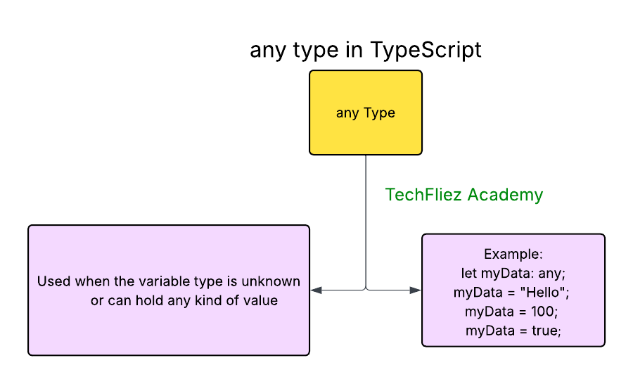 In TypeScript, the any type is a type that can hold any value. It acts as a way to opt-out of type checking and allow a variable to have any type of value. Using any gives you the flexibility of JavaScript’s dynamic typing but at the expense of losing the benefits of TypeScript’s static type checking.